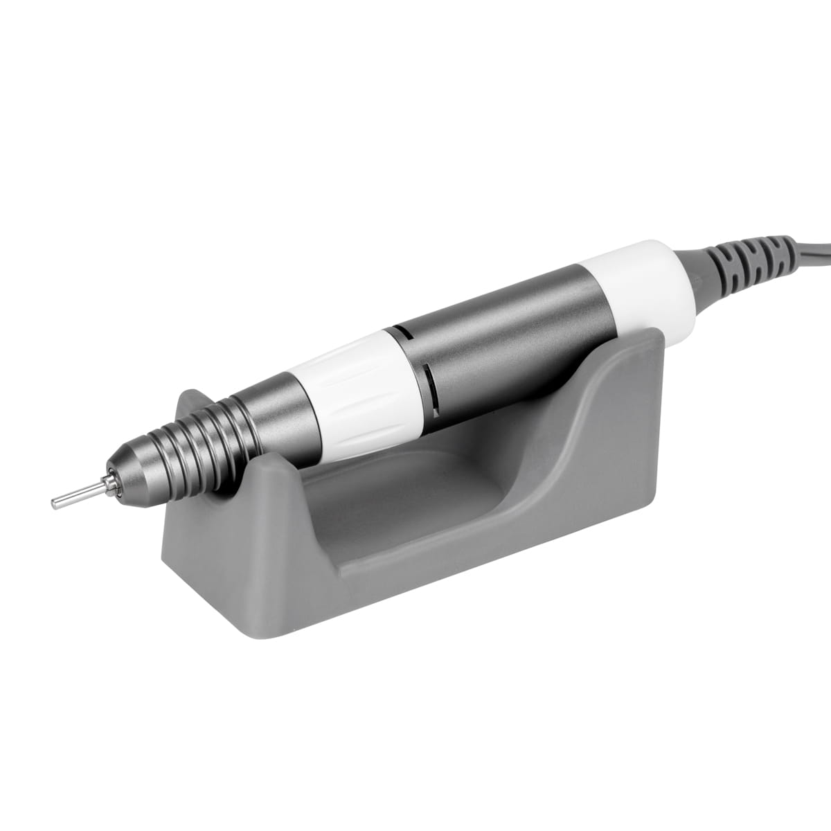 Czerwona dioda obok włącznika sygnalizuje stan pracy urządzenia. Prędkość obrotów głowicy frezarki można w łatwy sposób, płynnie dostosowywać przy użyciu specjalnego pokrętła w zakresie od 0 do 35 000 obrotów na minutę. Przełącznik z przodu urządzenia sprawnie zmienia kierunek obrotów, z kolei ten z tyłu pozwala na przestawianie sterowania – między ręcznym a nożnym. Do zestawu jest dołączony pedał, którego funkcja polega na włączaniu frezarki z uprzednio ustawionymi obrotami. Zapewnia to swobodną, komfortową pracę, dzięki możliwości sterowania urządzeniem bez zajmowania rąk. W trakcie pracy głowicę bezpiecznie można odłożyć na dedykowany silikonowy stojak lub odwiesić dzięki wygodnemu plastikowemu uchwytowi, który da się zamontować po obu stronach urządzenia.