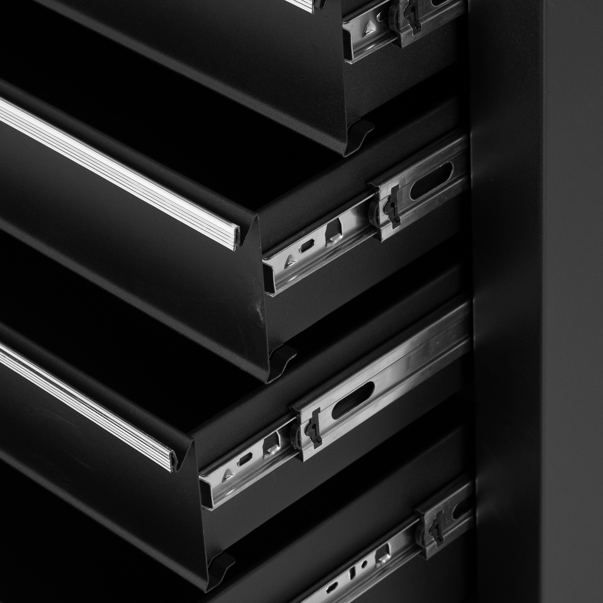 Model wyposażony jest w pięć pojemnych szuflad wykończonych matami antypoślizgowymi, a na górze znajduje się dodatkowa półka z matą antypoślizgową. Zapewniają bezpieczne przechowywanie narzędzi, tuszów i jednorazowych akcesoriów bez ryzyka ich przesuwania podczas otwierania czy przemieszczania pomocnika, wspierając utrzymanie porządku oraz sprawną organizację pracy.