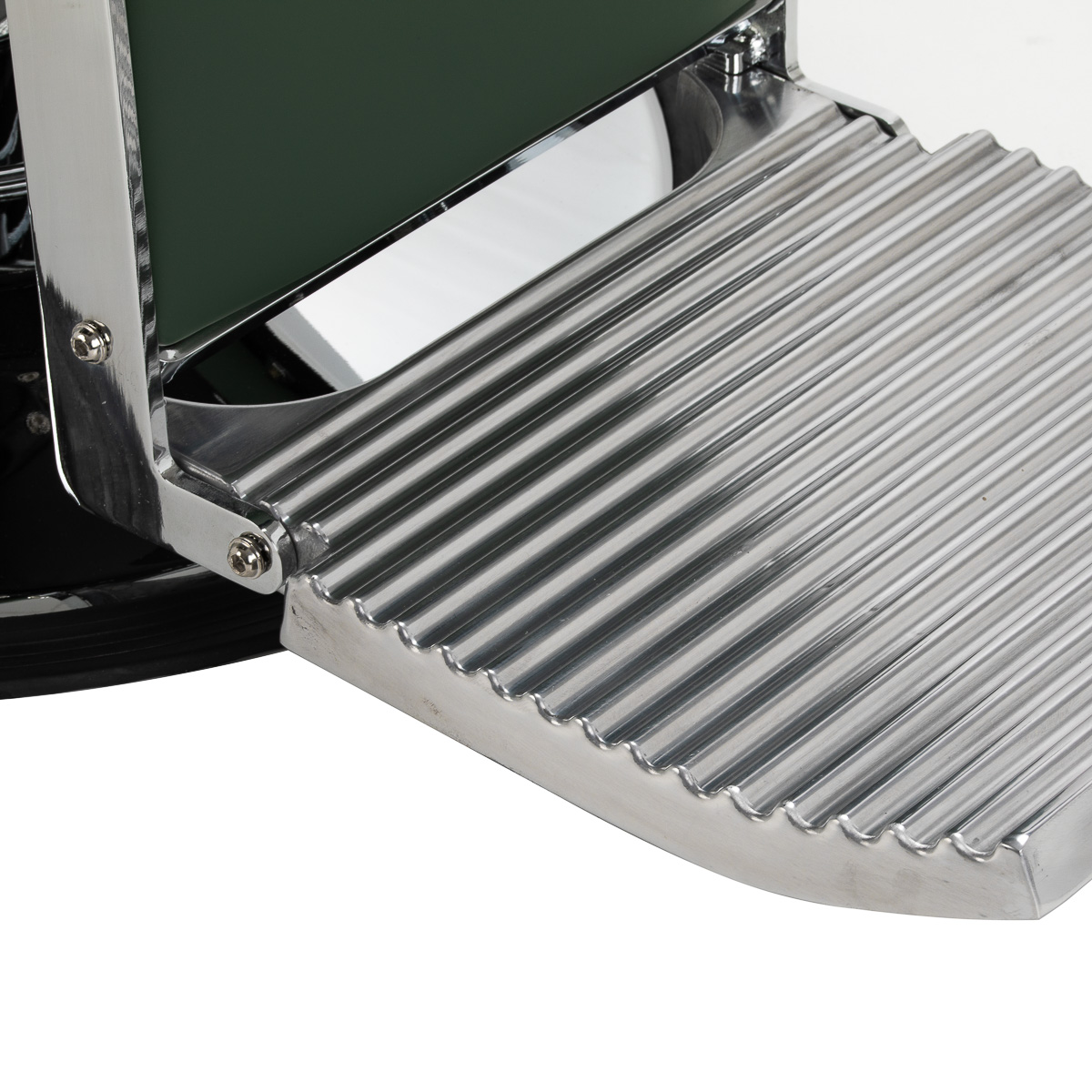 Solidna konstrukcja podstawy zapewnia stabilność oraz wysoki komfort użytkowania. Siedzisko wypełnione odporną na odkształcenia pianką oraz obite miękką, matową skórą syntetyczną łączy trwałość z komfortem. Materiały użyte do wykończenia są odporne na wilgoć, wytrzymałe i łatwe w czyszczeniu, co sprawia, że fotel doskonale sprawdza się w codziennej pracy. Stylowe przeszycia i tapicerka w odcieniach zieleni nadają mu wyjątkowego charakteru, idealnie komponującego się z wystrojem nowoczesnych salonów barberskich.