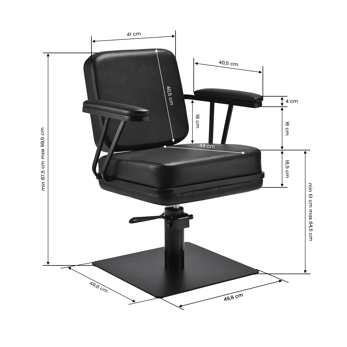 Wyprofilowany fotel zapewnia wsparcie lędźwi i wysoki komfort użytkowania, a tapicerowane podłokietniki umożliwiają prawidłowe ułożenie barków klienta. Stabilna, kwadratowa podstawa w matowej czerni podkreśla stylowy wygląd, a przyjemna w dotyku skóra syntetyczna w odcieniach czerni gwarantuje wygodę podczas długich zabiegów, trwałość, odporność na wilgoć i łatwość czyszczenia. Nowoczesny design nadaje wnętrzu wyjątkowego charakteru, a fotel sprawdza się zarówno w nowoczesnych, jak i klasycznych aranżacjach, podkreślając profesjonalny wizerunek salonu.
