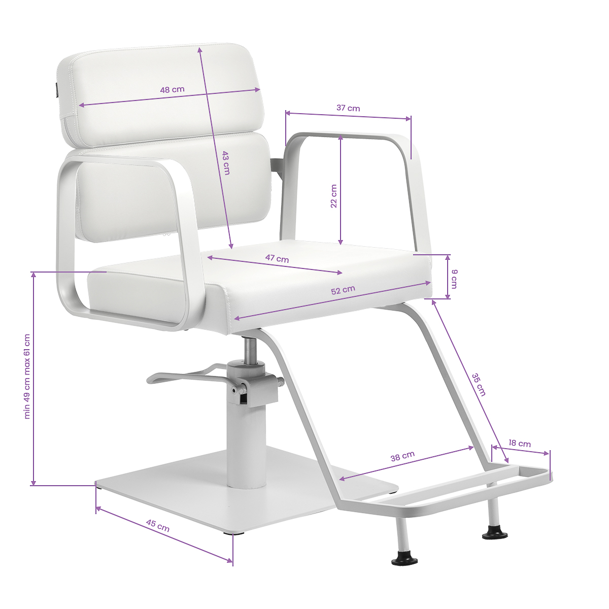 Trwały podnośnik hydrauliczny pozwala dostosować poziom siedziska w granicach 49-61 cm – nawet w momencie, gdy klient siedzi na fotelu. Zapewnia bardziej ergonomiczną pracę, umożliwiając dopasowanie poziomu siedziska do wzrostu zarówno klienta, jak i fryzjera. Ciekawe wizualnie oparcie pozwala na zajęcie dogodnej pozycji, zapewniając doskonałe wsparcie pleców, co ma znaczenie zwłaszcza w przypadku wielogodzinnych zabiegów. Dużym plusem tego modelu jest otwór pozostawiony pomiędzy oparciem a siedziskiem. Ułatwia on zachowanie czystości w salonie, pozwalając w łatwy sposób wymieść włosy z każdego zakamarka fotela. Pozwala to usprawnić przygotowanie stanowiska pracy pomiędzy klientami.