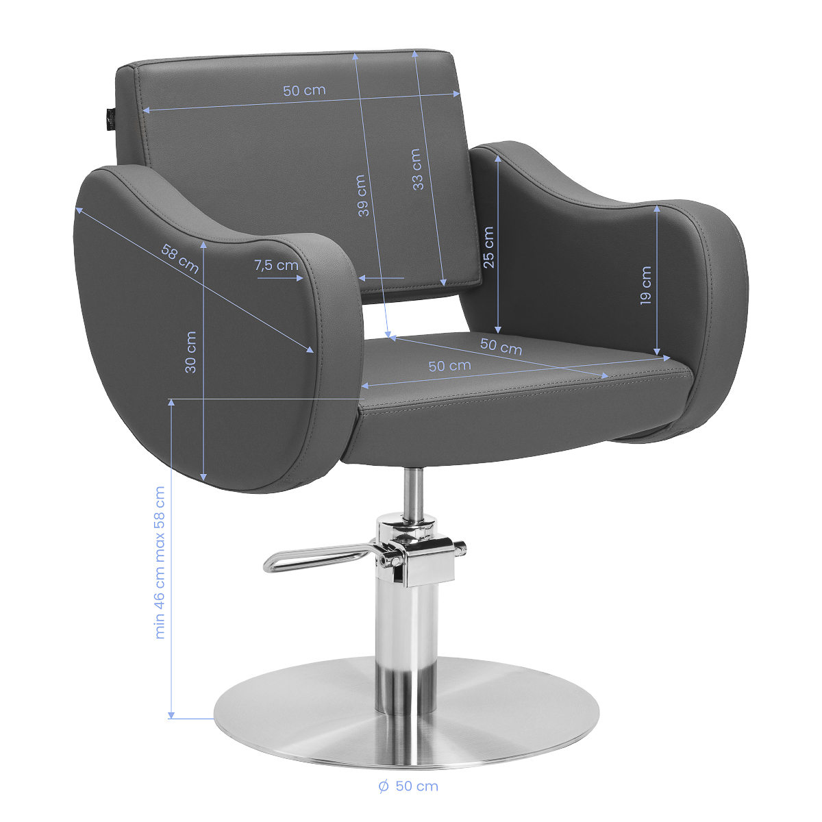 Solidny podnośnik hydrauliczny umożliwia płynną regulację wysokości siedziska w zakresie od 46 do 58 cm – również, gdy klient siedzi na fotelu. To praktyczne rozwiązanie pozwala łatwo dostosować pozycję do wzrostu zarówno klienta, jak i stylisty, wspierając ergonomiczną pracę. Profilowane oparcie zapewnia wygodną pozycję i stabilne podparcie pleców, co ma szczególne znaczenie podczas dłuższych zabiegów. Dodatkowym atutem jest mechanizm pełnego obrotu, który zwiększa swobodę ruchu i ułatwia dostęp do klienta z każdej strony.