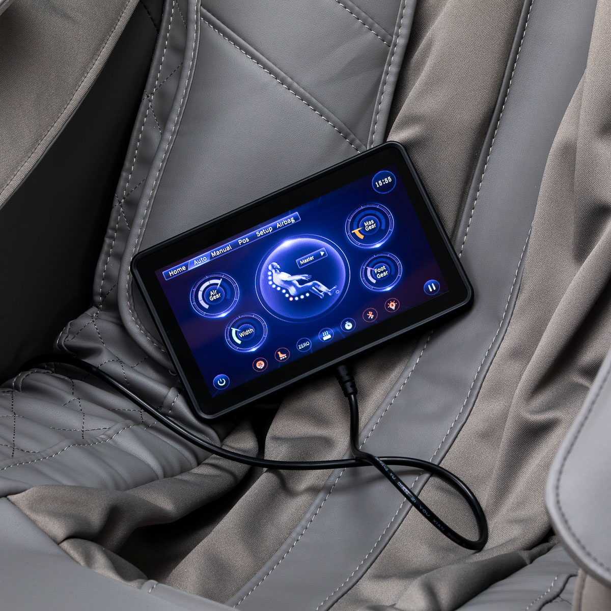Panel sterowania umożliwia łatwe dostosowanie masażu do indywidualnych potrzeb. Dla większej wygody można umieścić go w uchwycie na prawym podłokietniku lub trzymać w dłoniach. Na ekranie wyraźnie prezentowane są wszystkie kluczowe informacje – aktualnie masowane partie ciała, intensywność masażu, czas trwania sesji oraz wybrany program. Panel pozwala przełączać się między trybami automatycznymi i manualnymi oraz włączać sterowanie głosem, zwiększając komfort obsługi. Za jego pomocą można wygodnie wybierać spośród dostępnych trybów masażu, regulować intensywność, dopasować ustawienia fotela i precyzyjnie dostosowywać czas sesji w odstępach co 5 minut (5, 10, 15, 20, 25 lub 30 minut), zapewniając idealną długość masażu dopasowaną do potrzeb użytkownika.