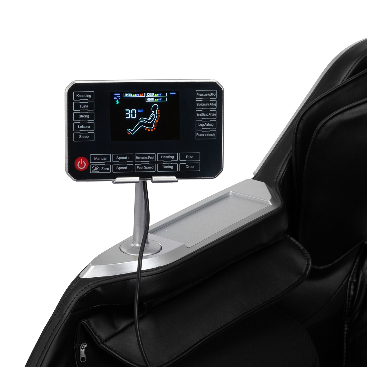 Przejrzysty panel sterowania z czytelnym ekranem LCD zapewnia intuicyjną obsługę fotela. Może być wygodnie umieszczony w uchwycie na prawym podłokietniku lub trzymany w dłoni. Na wyświetlaczu prezentowane są informacje o aktualnie masowanej partii ciała, intensywności masażu, czasie trwania sesji oraz wybranym programie. Za pomocą panelu można łatwo regulować pozycję fotela, wybrać preferowany tryb masażu oraz ustawić czas zabiegu – 15, 20, 25 lub 30 minut.