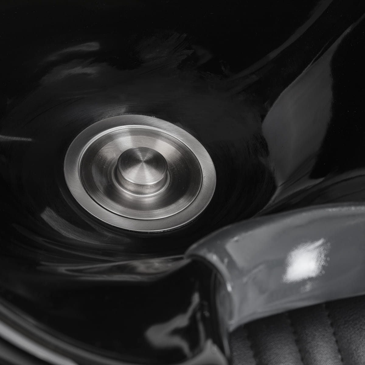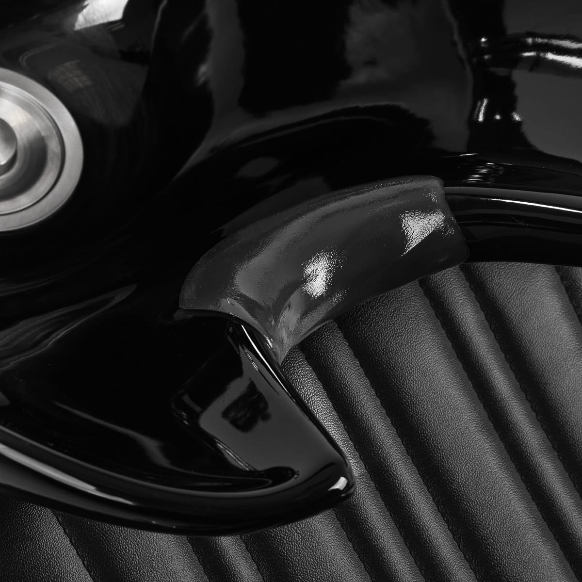 Wyprofilowany fotel wypełniony trwałą pianką zapewnia komfort użytkowania, a tapicerowane podłokietniki ułatwiają prawidłowe ułożenie barków klienta. Oparcie umieszczone pod optymalnym kątem sprzyja doskonałemu wsparciu kręgosłupa. Pokrycie ze skóry syntetycznej w odcieniach czerni gwarantuje wieloletnią wytrzymałość oraz łatwość czyszczenia. Stylowe przeszycia na tapicerce nadają myjni charakteru inspirowanego designem motoryzacyjnym, podkreślając jej efektowny wygląd. W zestawie znajduje się kompletna armatura w odcieniach chromu i czerni, w tym bateria, słuchawka prysznicowa oraz dedykowane węże, aby zapewnić całkowity zestaw narzędzi do pracy.