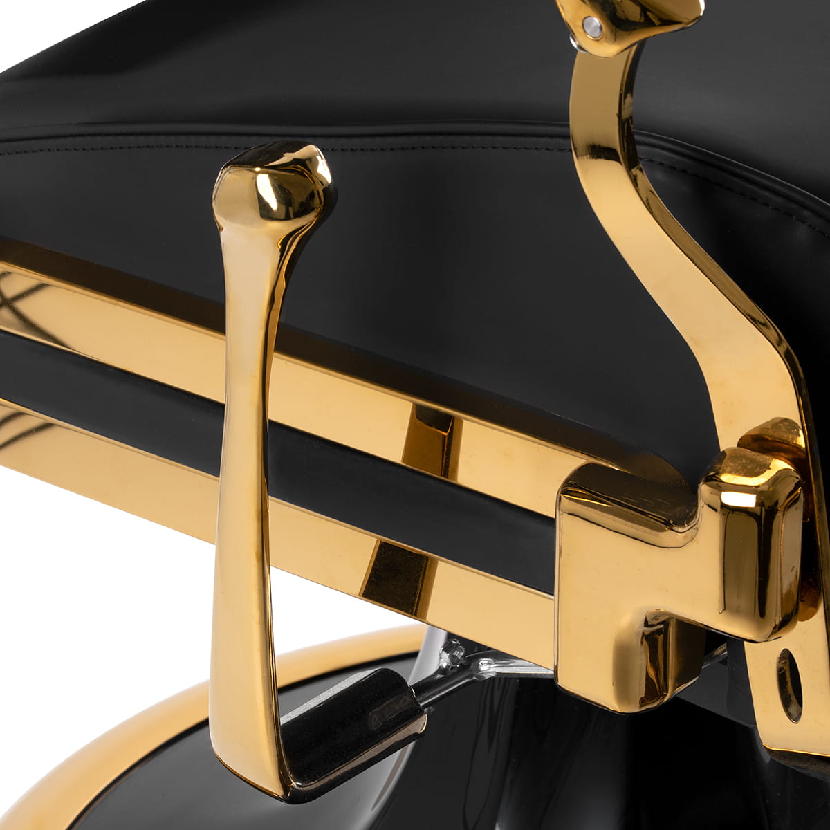 Solidna, szeroka podstawa gwarantuje stabilność oraz wysoki komfort użytkowania. Wypełnienie siedziska wykonane z odpornej na odkształcenia pianki oraz obicie ze skóry syntetycznej zapewniają trwałość mebla i jego komfortowe użytkowanie przez długi czas. Tapicerka jest odporna na wilgoć, wytrzymała oraz łatwa do czyszczenia. Połączenie czerni z elementami złota dodaje fotelowi elegancji, dzięki czemu staje się on efektowną ozdobą wnętrza, idealnie wpisującą się w wystrój nowoczesnego salonu barberskiego.