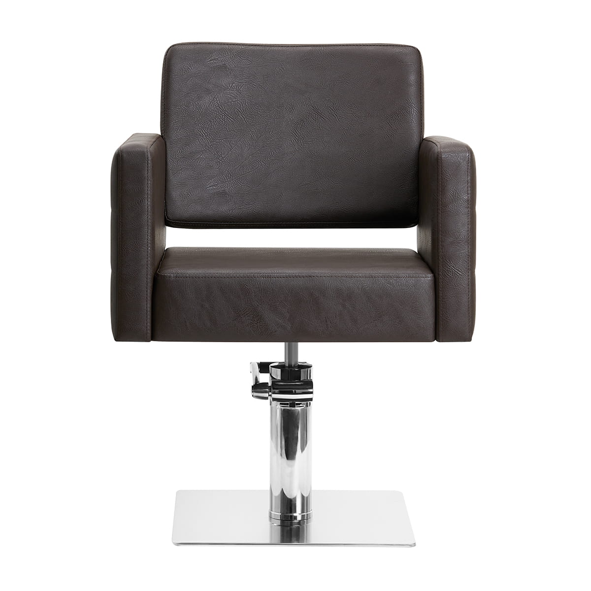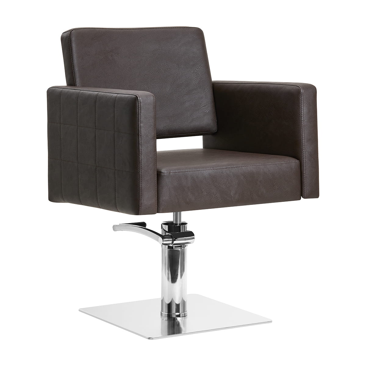 Solidna, płaska podstawa w kształcie kwadratu zapewnia stabilność w trakcie użytkowania. Gładka powierzchnia o lustrzanym wykończeniu nadaje elementowi elegancki wygląd i sprawia, że ten jest łatwy do utrzymania w czystości. Wygodne siedzisko wypełnione trwałą pianką zapewnia wysoki komfort użytkowania, nawet podczas wielogodzinnych zabiegów. Obite skórą syntetyczną podłokietniki z ozdobnymi przeszyciami są ciekawym wizualnie elementem, a co ważniejsze, pozwalają na prawidłowe ułożenie barków klienta. Sprawia to, że nie chowa on głowy w ramionach ani się nie garbi – wyraźnie ułatwia to wykonywanie precyzyjnych zabiegów, w tym strzyżenia. Wyposażenie fotela w mechanizm pełnego obrotu sprawia, że praca fryzjera staje się bardziej efektywna i wygodna.