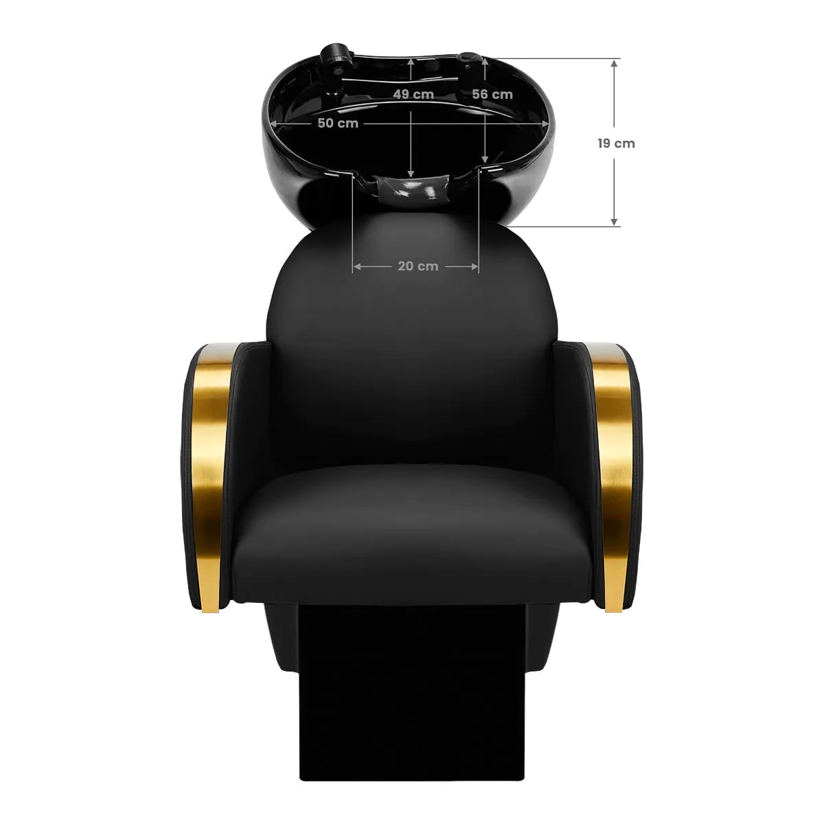Odpowiednio wyprofilowany fotel wypełniony trwałą pianką zapewnia wysoki komfort użytkowania, a eleganckie podłokietniki pozwalają na prawidłowe ułożenie barków klienta. Oparcie umieszczone pod optymalnym kątem pozwala na zajęcie odpowiedniej pozycji i sprzyja doskonałemu wsparciu kręgosłupa. Pokrycie w odcieniach czerni oraz ozdobne powierzchnie metalowe lakierowane w barwach złota nadają mu wyraz ponadczasowej elegancji, a dodatkowo gwarantują wieloletnią wytrzymałość oraz łatwość czyszczenia. Wyróżniające myjnię klasyczne wykończenie sprawia, że będzie doskonale prezentować się w niemal każdej przestrzeni. W zestawie znajduje się kompletna armatura w odcieniach czerni, w tym bateria, słuchawka prysznicowa oraz dedykowane węże, aby zapewnić całkowity zestaw narzędzi do pracy.