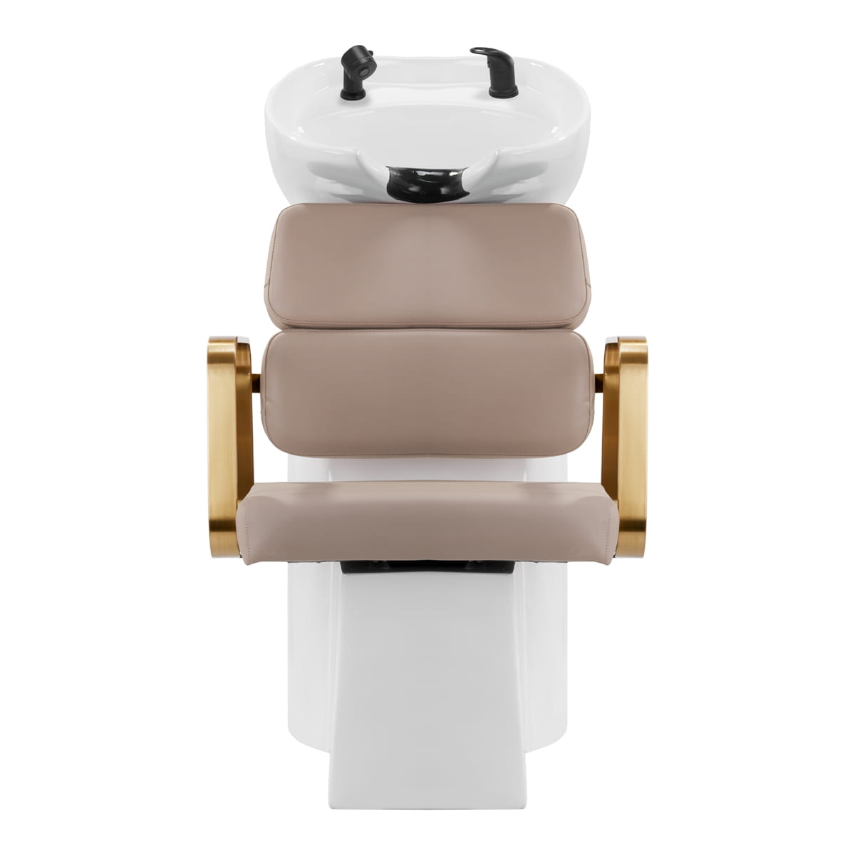 Wyprofilowany fotel zapewnia odpowiednie wsparcie lędźwi, a co za tym idzie wysoki komfort użytkowania. Metalowe podłokietniki w odcieniach złota o geometrycznym kształcie pozwalają na prawidłowe ułożenie barków klienta. Wypełnienie z trwałej, odpornej na odkształcenia pianki oraz obicie wykonane z przyjemnej w dotyku skóry syntetycznej w odcieniach beżu zapewniają trwałość mebla, łatwość czyszczenia i komfortowe użytkowanie przez długi czas. Oryginalny, elegancki wygląd myjni nadaje wnętrzom niepowtarzalnego wyrazu. W zestawie znajduje się kompletna armatura w odcieniach czerni, w tym bateria, słuchawka prysznicowa oraz dedykowane węże, aby zapewnić kompletny zestaw narzędzi do pracy.