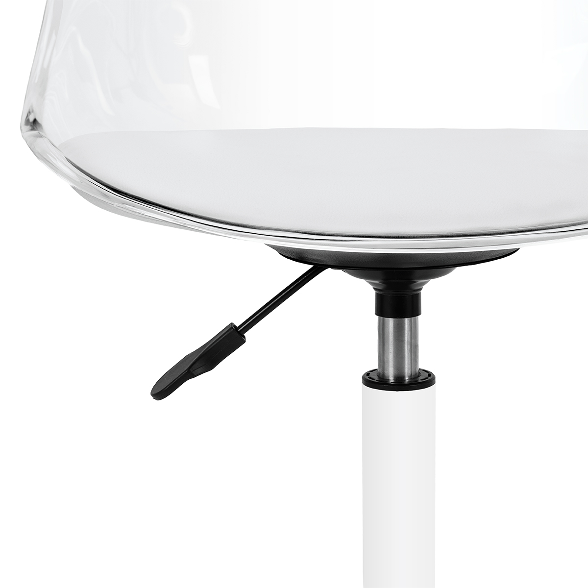 Model przyciąga uwagę efektownym, transparentnym oparciem, nadającym całości lekkości i nowoczesnego charakteru. Połączenie przejrzystej konstrukcji z tapicerowaną białą skórą syntetyczną poduszką siedziska oraz białą podstawą tworzy wyrafinowany kontrast podkreślający elegancję. Dzięki temu krzesło staje się nie tylko funkcjonalnym elementem wyposażenia, lecz także stylową ozdobą gabinetu. Świetnie komponuje się z każdym wnętrzem, doskonale wpisując się w estetykę współczesnych salonów beauty.