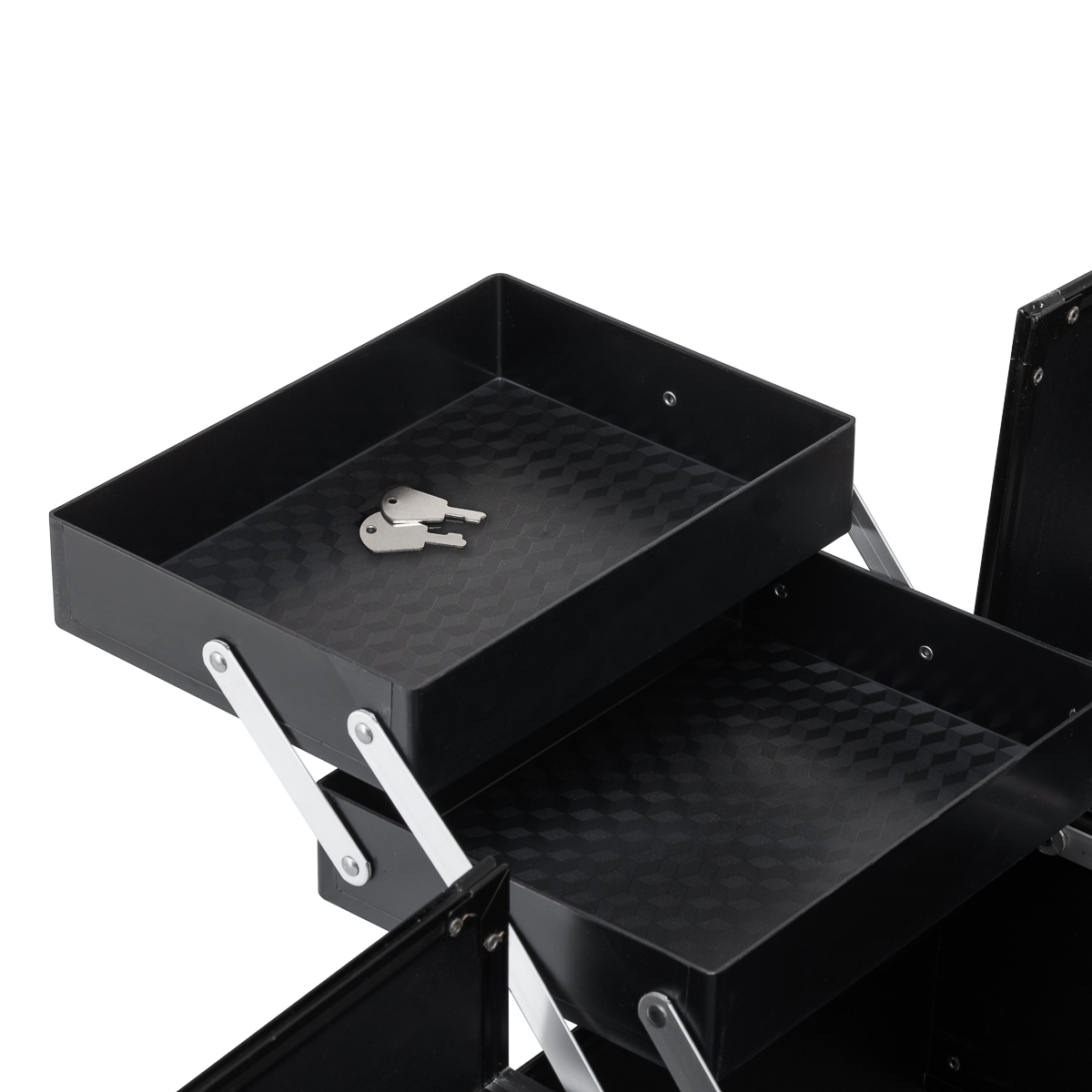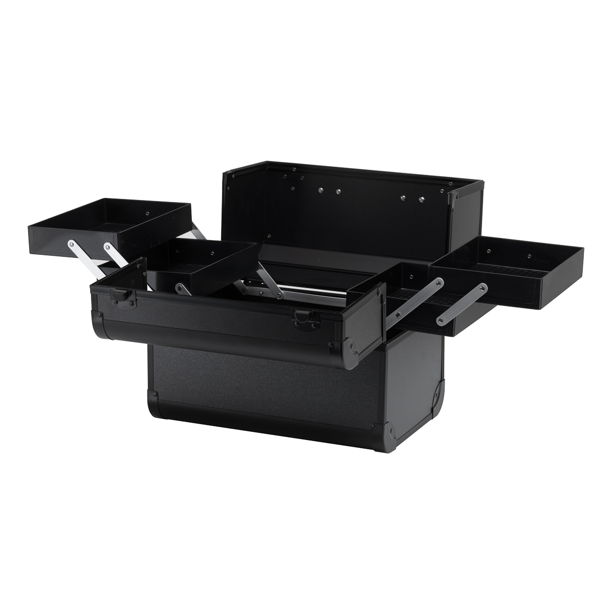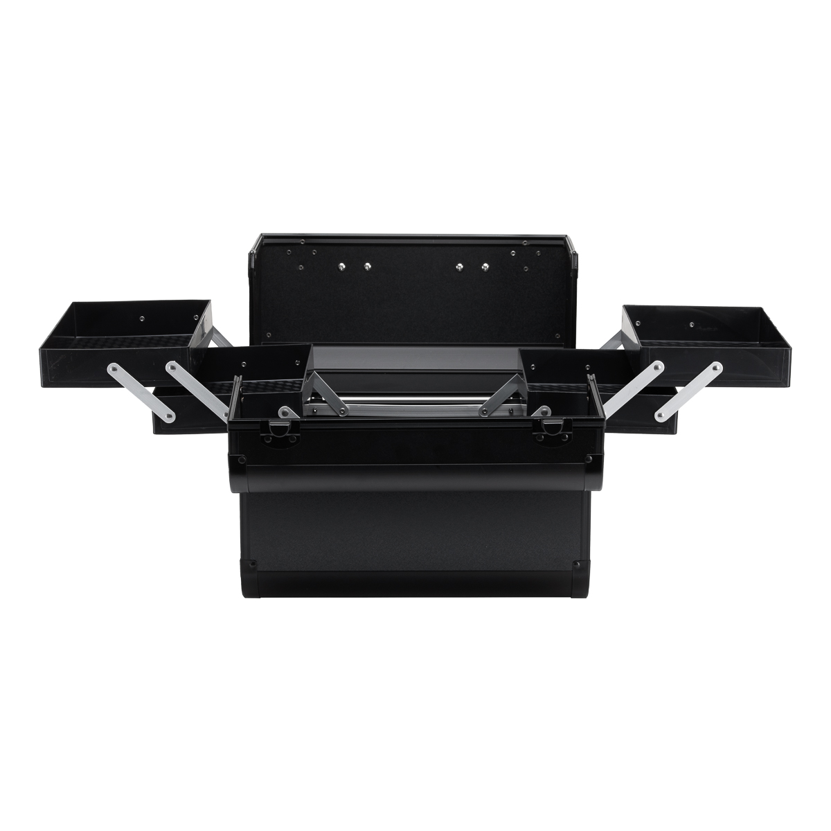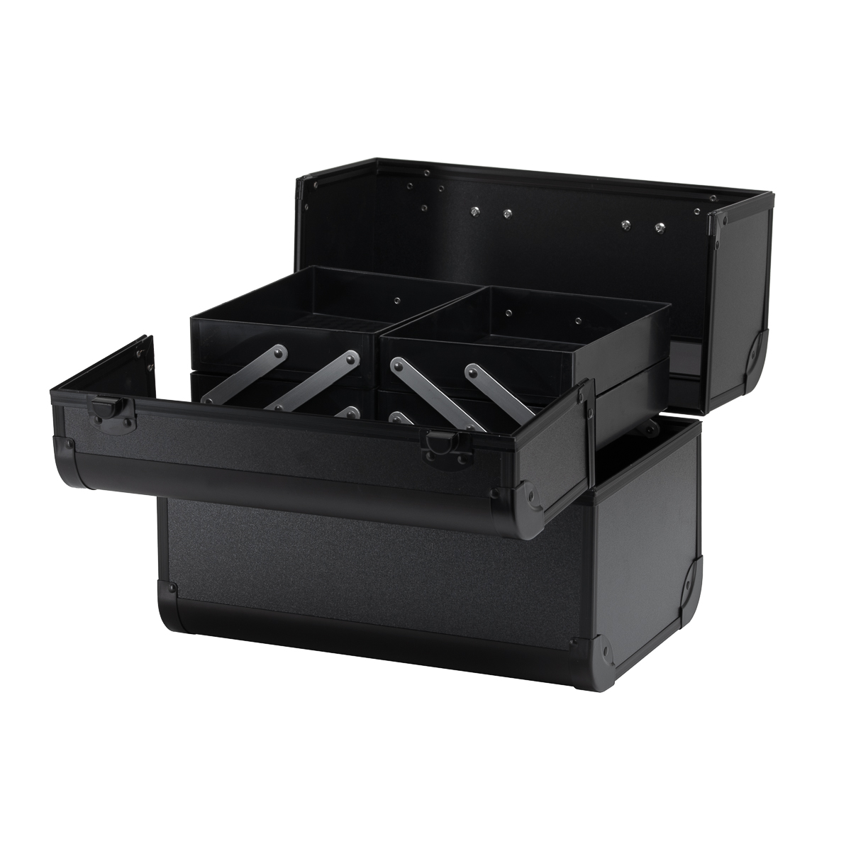 Nowoczesny design z gładkim wykończeniem ścianek w odcieniach czerni z metalicznymi akcentami dodaje elegancji. Rączka ułatwia transport, co jest szczególnie ważne dla mobilnych stylistów. Wykonany z wytrzymałych, odpornych na uszkodzenia materiałów zapewnia komfort użytkowania na co dzień. Solidne zamknięcie na zatrzaski z kluczykiem zapewnia ochronę zawartości, a lekka, trwała konstrukcja sprawia, że kuferek jest łatwy do przenoszenia.
