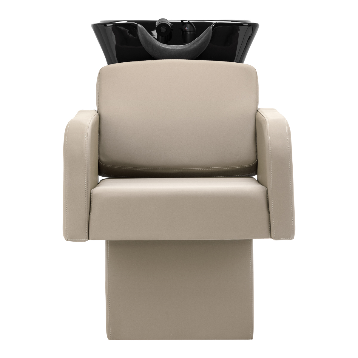 Ceramiczna misa umywalki w odcieniach czerni, o nowoczesnym kształcie i odpowiedniej głębokości, skutecznie zapobiega rozchlapywaniu wody oraz produktów używanych podczas zabiegów, umożliwiając komfortowe i efektywne wykonywanie szerokiej gamy usług. Odpowiednio wyprofilowany kołnierz oraz nachylone oparcie zapewniają wygodę i wsparcie podczas mycia włosów, a nakładka z tworzywa sztucznego w odcieniach czerni chroni klienta przed chłodem ceramicznej powierzchni, gwarantując przyjemne doznania w trakcie zabiegu.