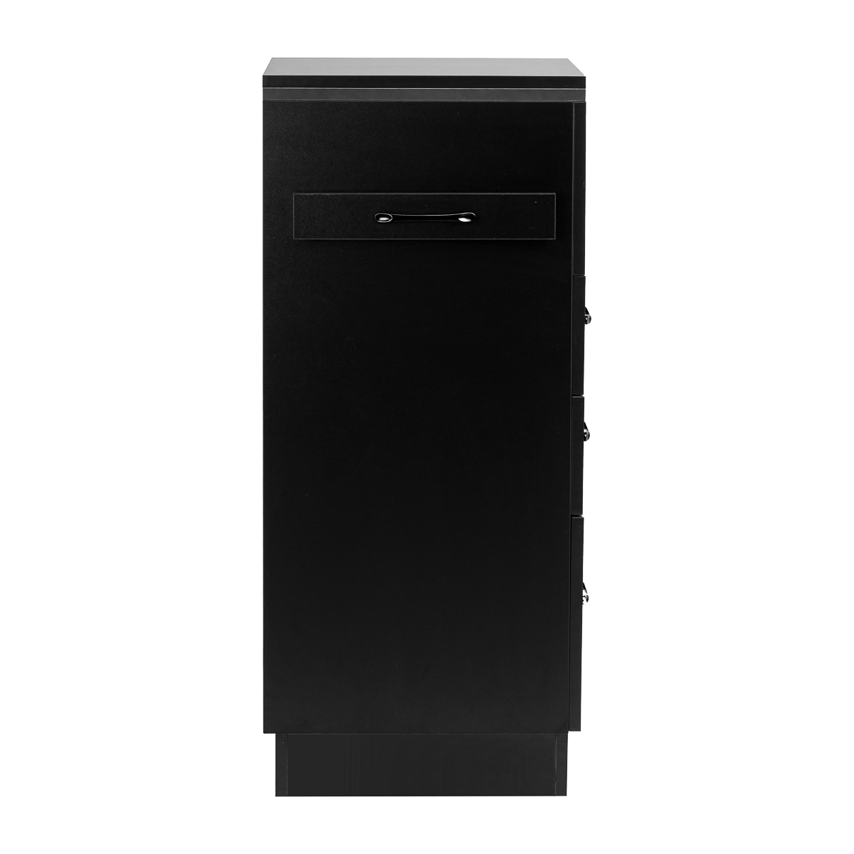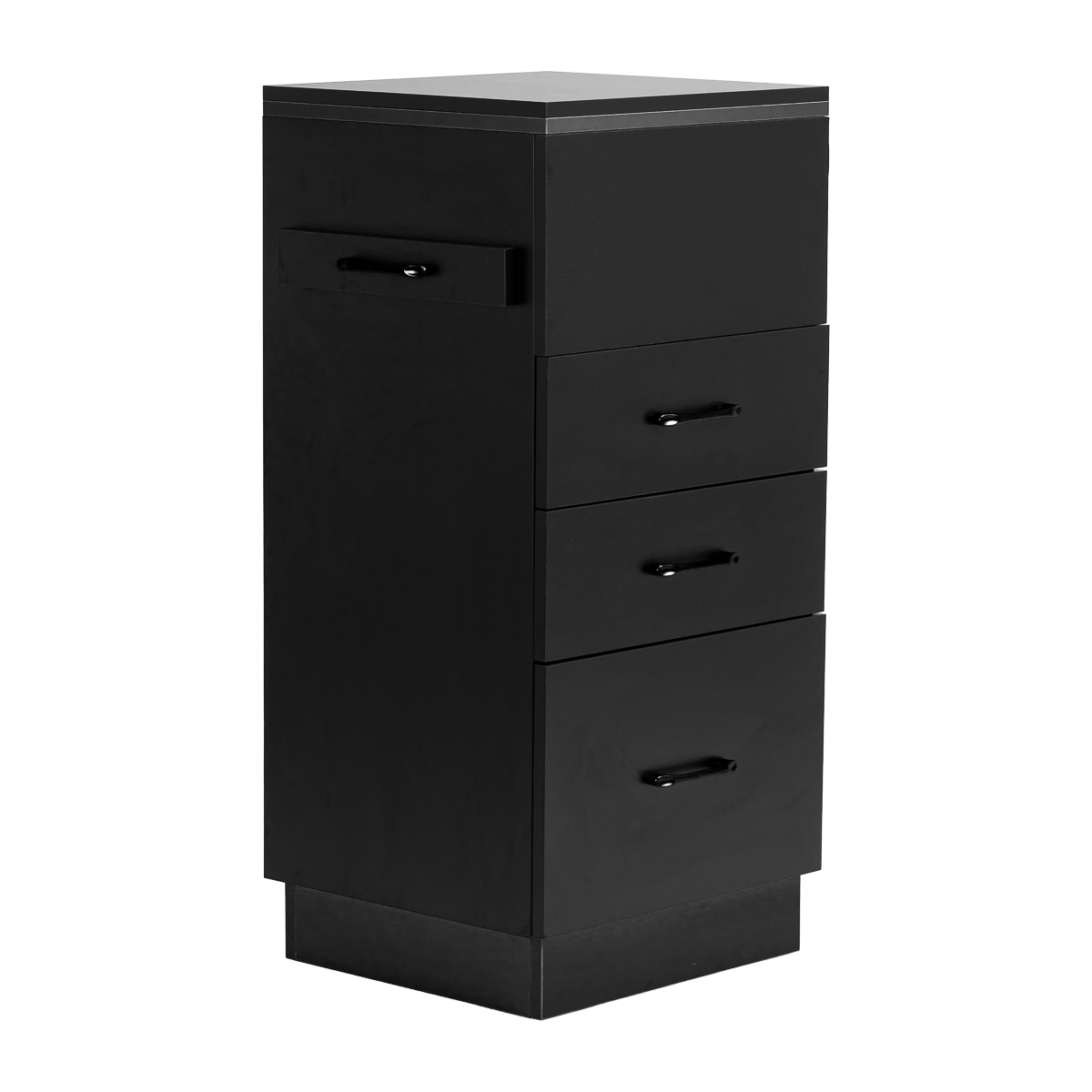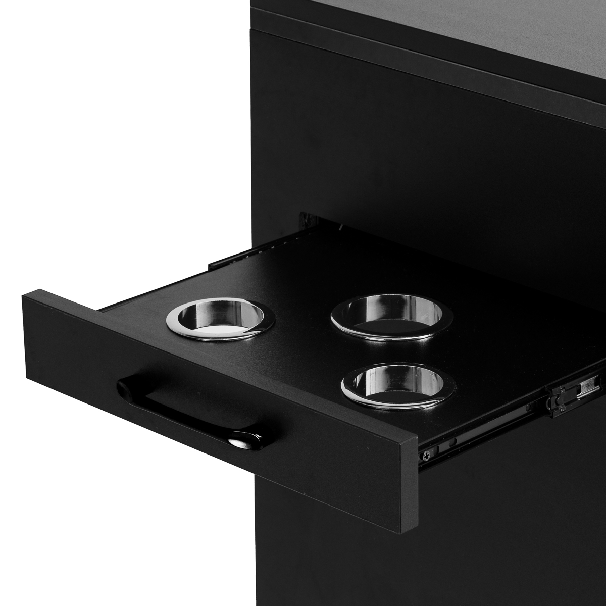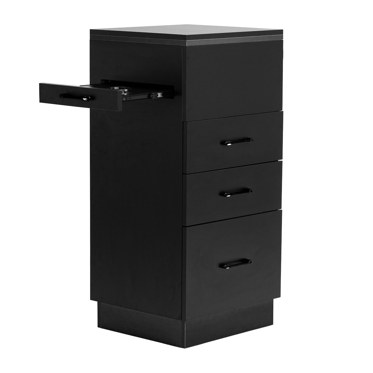 Klasyczna czerń nadaje pomocnikowi nowoczesnego, prestiżowego charakteru, który świetnie dopasuje się zarówno do minimalistycznych, jak i bardziej wyrazistych aranżacji. Solidna konstrukcja zapewnia stabilność, a gładka powierzchnia ułatwia utrzymanie mebla w czystości. Czarne uchwyty nie tylko podkreślają elegancki design, ale także zapewniają wygodne otwieranie każdej z szuflad. To praktyczne rozwiązanie do salonu fryzjerskiego, w którym liczy się porządek, wygodny dostęp do narzędzi oraz estetyka stanowiska pracy.