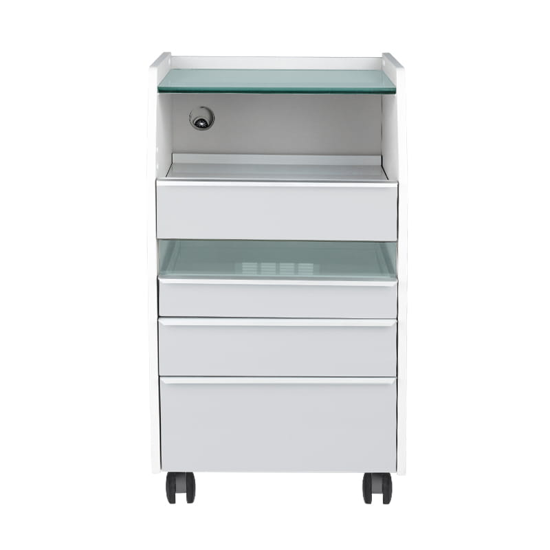 Wysokiej jakości pomocnik podologiczny to funkcjonalny mebel kosmetyczny na kółkach. Dzięki swojej mobilności możesz transportować go do innych pomieszczeń zabiegowych. Pomocnik posiada szklany blat roboczy, szuflady na narzędzia, akcesoria oraz wysuwaną półkę na frezarkę podologiczną lub inne urządzenie. Jedna szuflada posiada wbudowaną lampę UV-C dla zachowania lepszej sterylności narzędzi i akcesoriów.