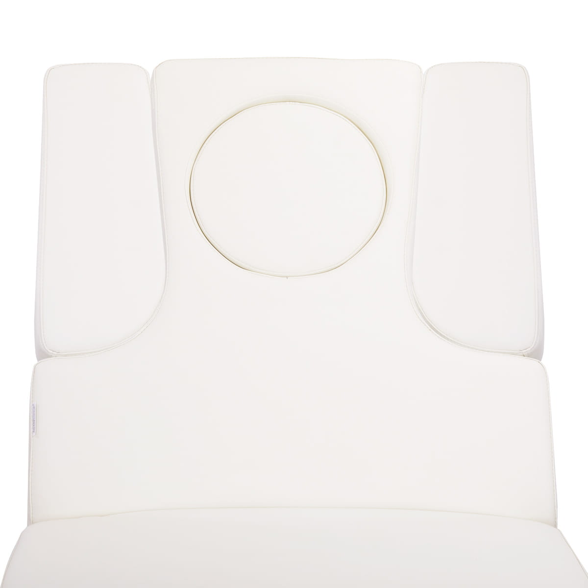 Nowa leżanka kosmetyczna. Absolutny hit wśrod leżanek. Elektryczna regulacja wysokości w bardzo szerokim zakresie 62-90 cm. Oparcie również regulowane za pomocą pilota, od pozycji poziomej do niemal pionu (podnosi się do 80 stopni). Możliwość wysunięcia w bok bądź całkowitego demontażu części bocznych oparcia. W zestawie jest jedna poduszka. W dolnej cześci, pod oparciem, znajduje się szufladka na podręczne akcesoria. Mebel szeroki (76 cm), z grubym i bardzo wygodnym materacem. Leżanka jest bardzo stabilna. Posiada obicie z wysokiej jakości ekoskóry w delikatnym odcieniu ecru.