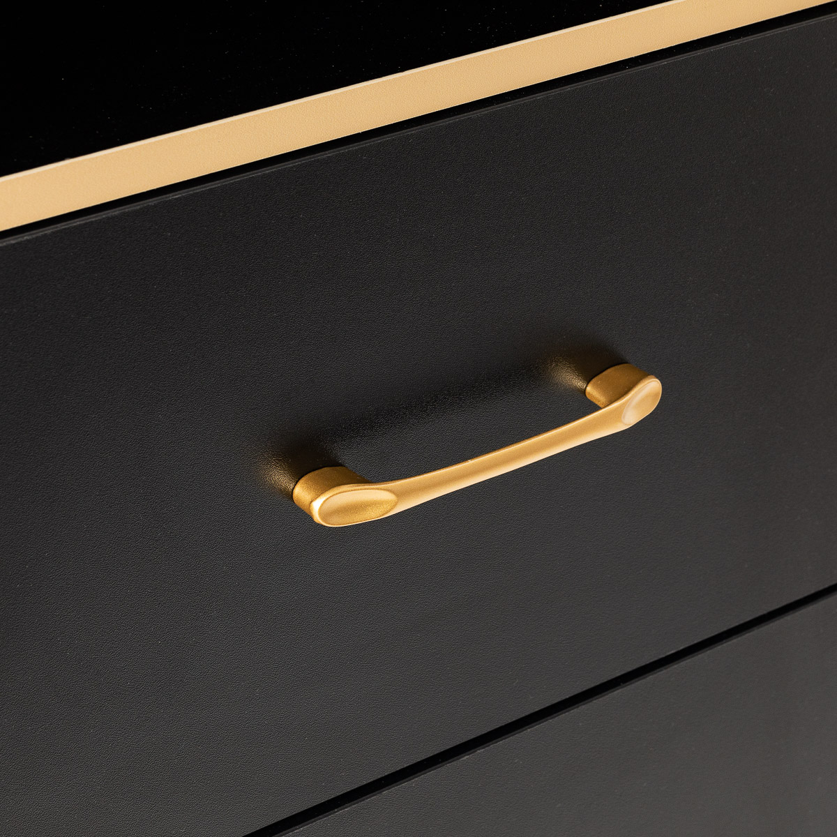 Solidna konstrukcja zapewnia stabilność, a gładkie powierzchnie ułatwiają utrzymanie mebla w czystości. Klasyczna kolorystyka nadaje szafce ponadczasowy charakter, który świetnie dopasuje się zarówno do minimalistycznych, jak i bardziej wyrazistych aranżacji. Złote uchwyty nie tylko podkreślają elegancki design, ale także zapewniają wygodne otwieranie każdej z szafek i szuflad. Całość stanowi praktyczne rozwiązanie do salonu fryzjerskiego, w którym istotne są porządek, ergonomia pracy oraz spójna estetyka stanowiska.