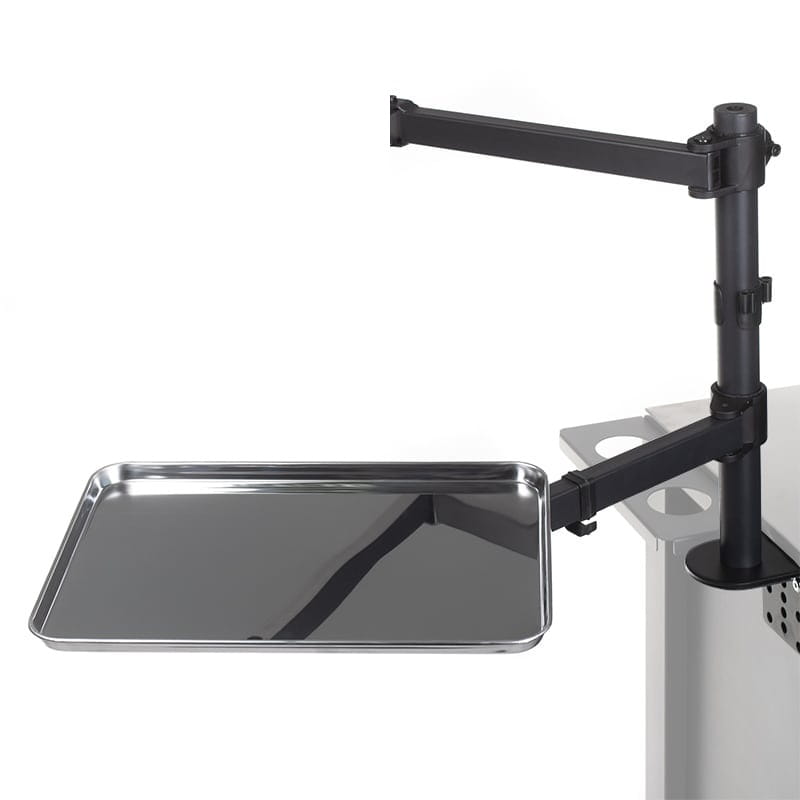 Uchwyt - wysięgnik z tacką do blatu stacji roboczej INKOO. Regulowana wysokość położenia uchwytu oraz trzy ruchome przeguby wysięgnika tacki.