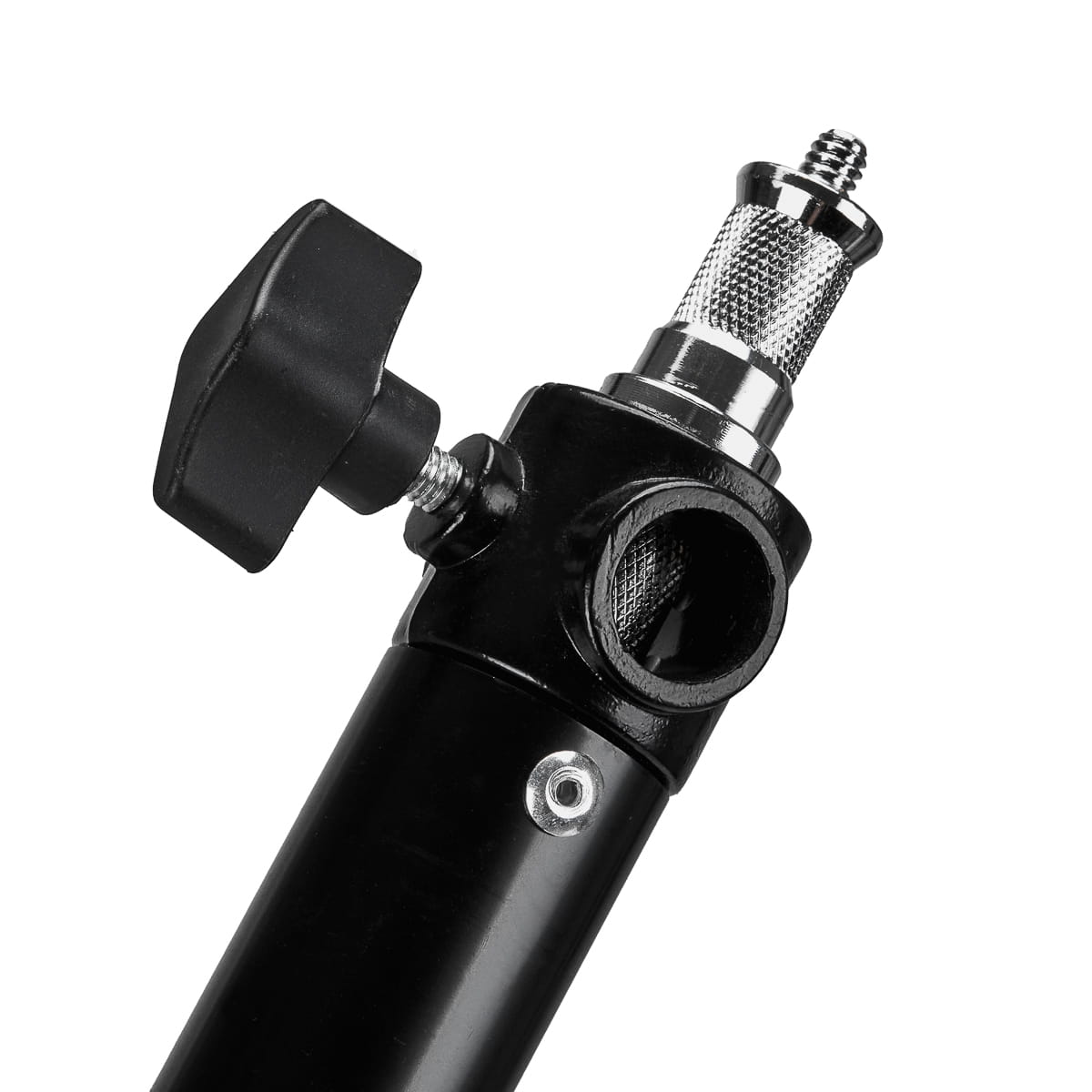 Teleskopowa konstrukcja daje możliwość dostosowania długości ramienia w zakresie od 73 do 131 cm. Regulacja kąta ułożenia statywu zapewnia znaczną swobodę ruchu w pionie i poziomie, umożliwiając precyzyjne skierowanie oświetlenia w wybranym kierunku. Dwustronny trzpień montuje się w jednym z trzech otworów, co pozwala dobrać odpowiednie ustawienie oświetlenia do własnych potrzeb.